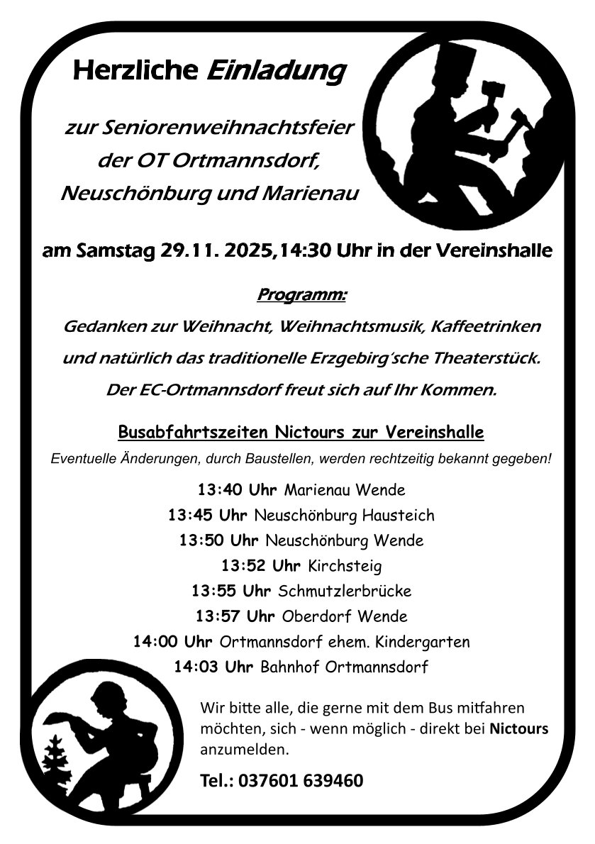Der EC Jugendkreis Ortmannsdorf lädt alle Senioren aus Neuschönburg, Marienau und Ortmannsdorf herzlich ein. Lassen Sie uns gemeinsam die Weihnachtszeit genießen und schöne Erinnerungen schaffen.